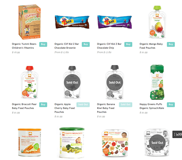 After clicking on the Food category, lots of familiar products will pop up like Clif bars for kids, Happy Baby food pouches and Perfectly Health baby formula. If the product is currently out of stock you it will appear in black and white with a SOLD OUT sign. I love this because you don’t have to waste your time adding it to your cart to find out it’s out of stock.