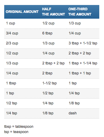 Jenna H says July 22, 2016 at 1:59 am This is just the chart I am looking for. I live with one other person so many recipes make way too much food for us. Loading...
