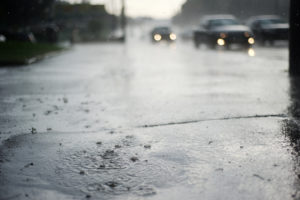 Puddle near the wet road in the rain