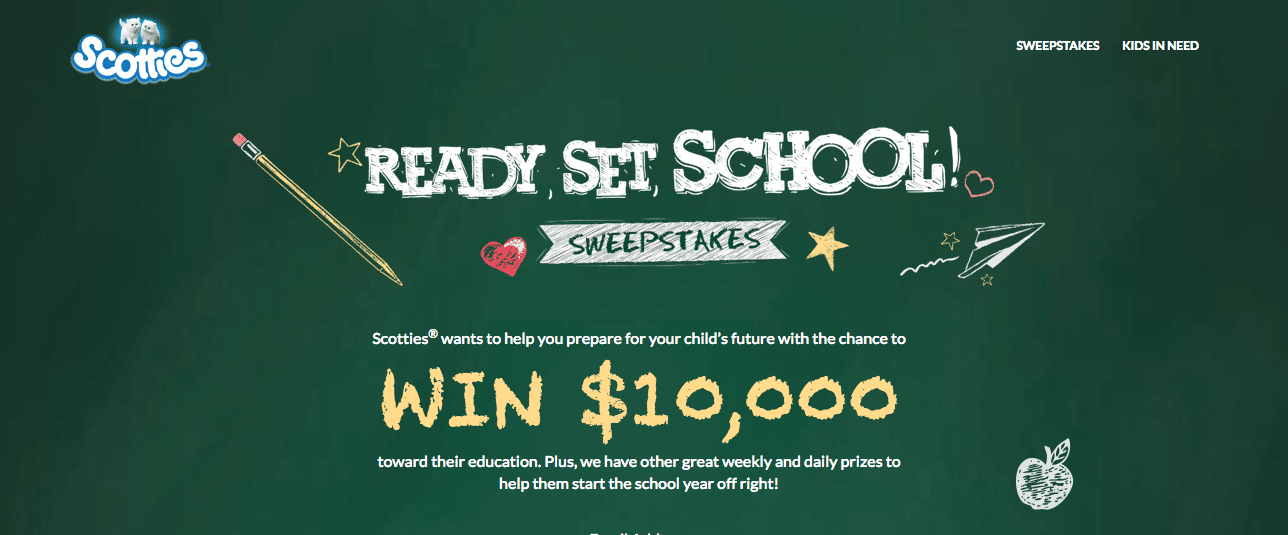 After you’ve taken the time to help kids in need by sharing a video with the appropriate hashtag on social media, it’s time for you to enter to win some goodies for yourself! Enter Scotties’ Ready Set School Sweeps to try to win one of many prizes including $10,000 towards your child’s education, $500 classroom makeover or BIC products for your backpack.