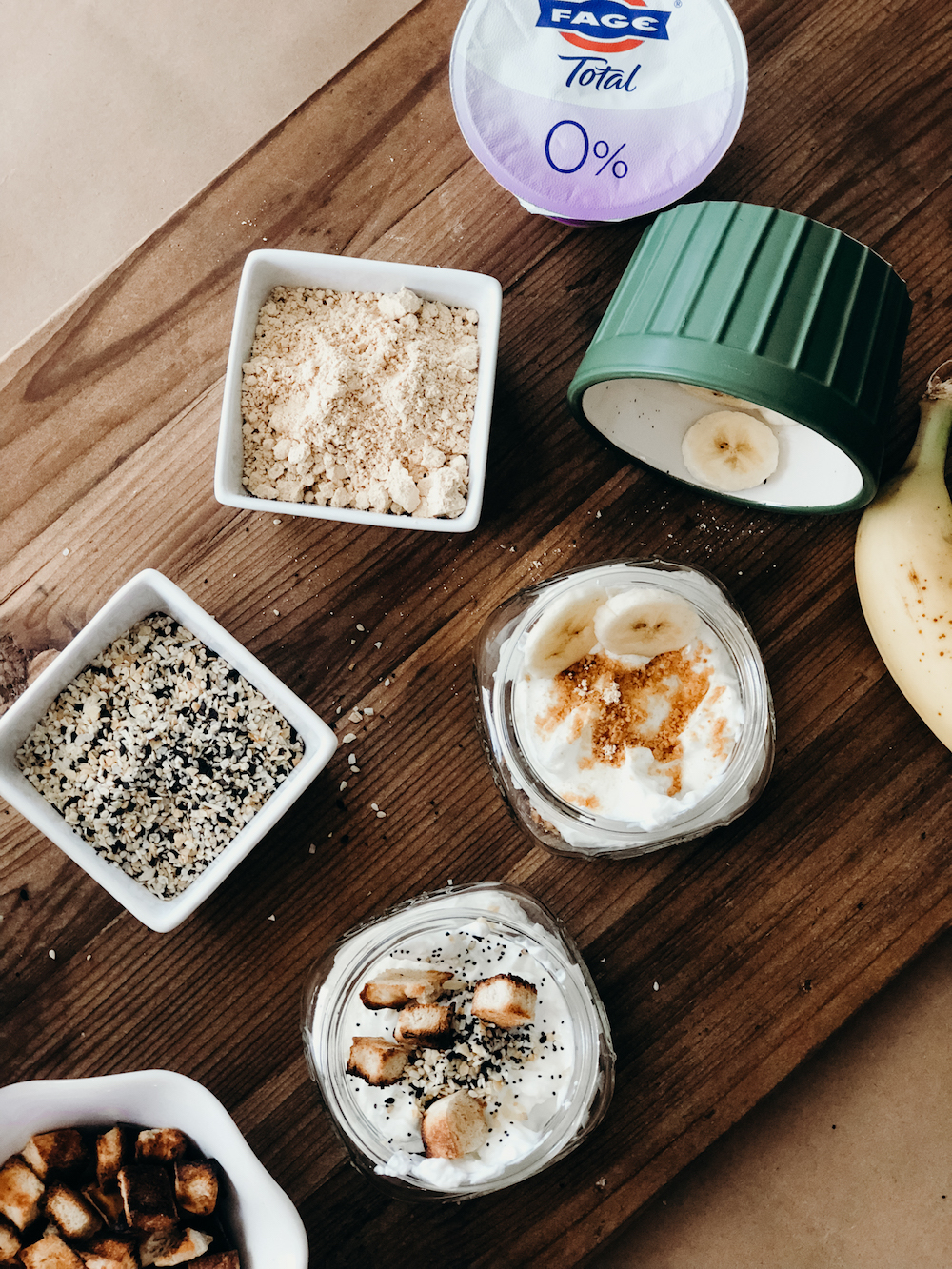In case you’re not a fan of yogurt with sweet ingredients, you might just love my savory greek yogurt bar idea. Sprinkle your plain Fage Total 0% with your favorite brand of everything bagel seasoning, and homemade bagel croutons.